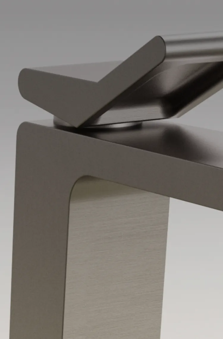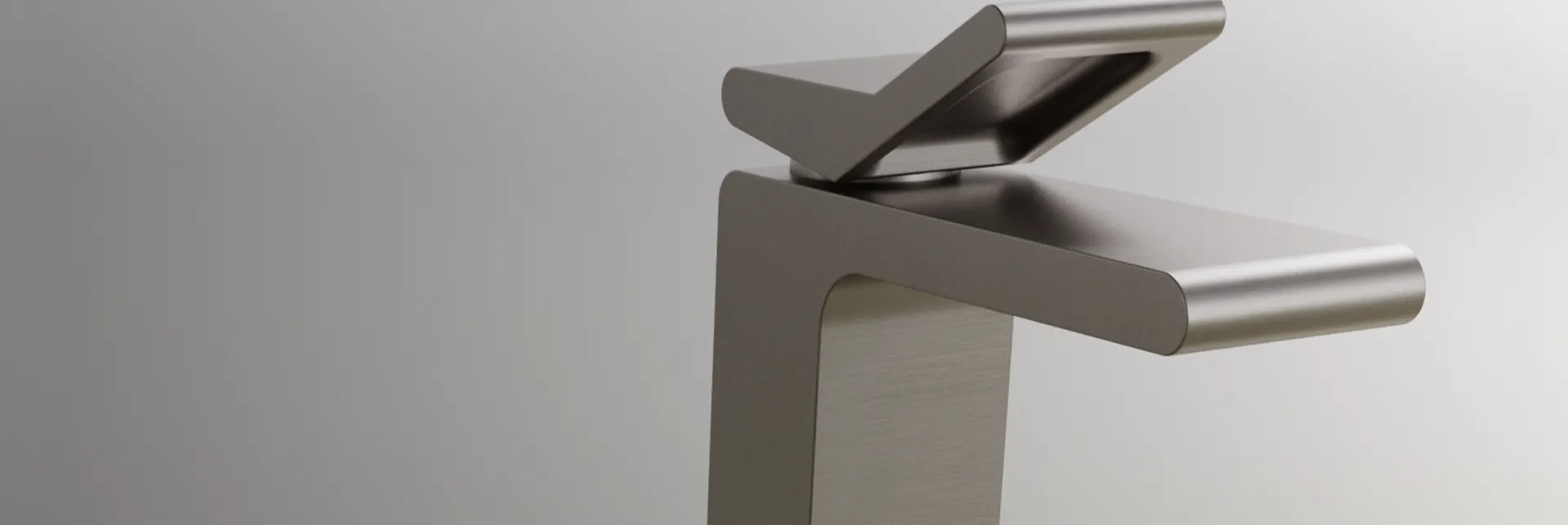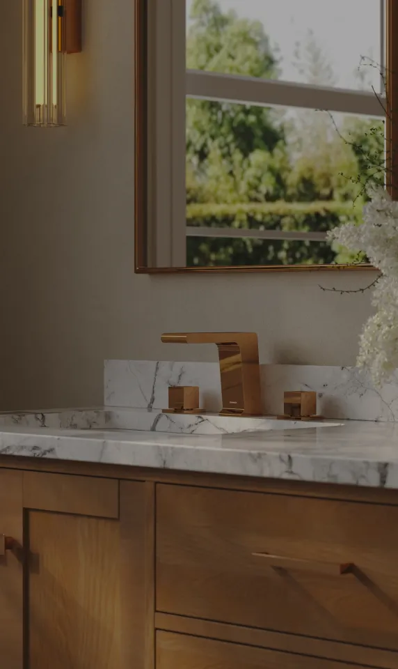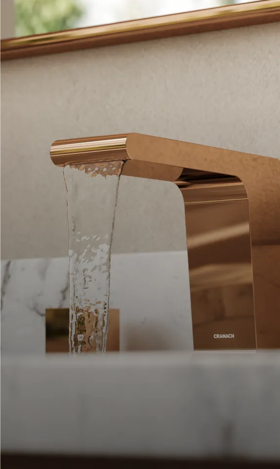 The Farne undermount faucet showcases a prominent planar handle and an elegantly arched spout. Its weighted, solid construction and zirconium brushed gold finish guarantee daily reliability, establishing a durable and luxurious centerpiece for your vanity.