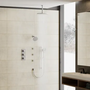 Experience a drenching rain with the Farne shower set’s large showerhead, a design which then extends its language of soft edges and strong geometry across all matching accessories to build a perfectly unified bath environment.