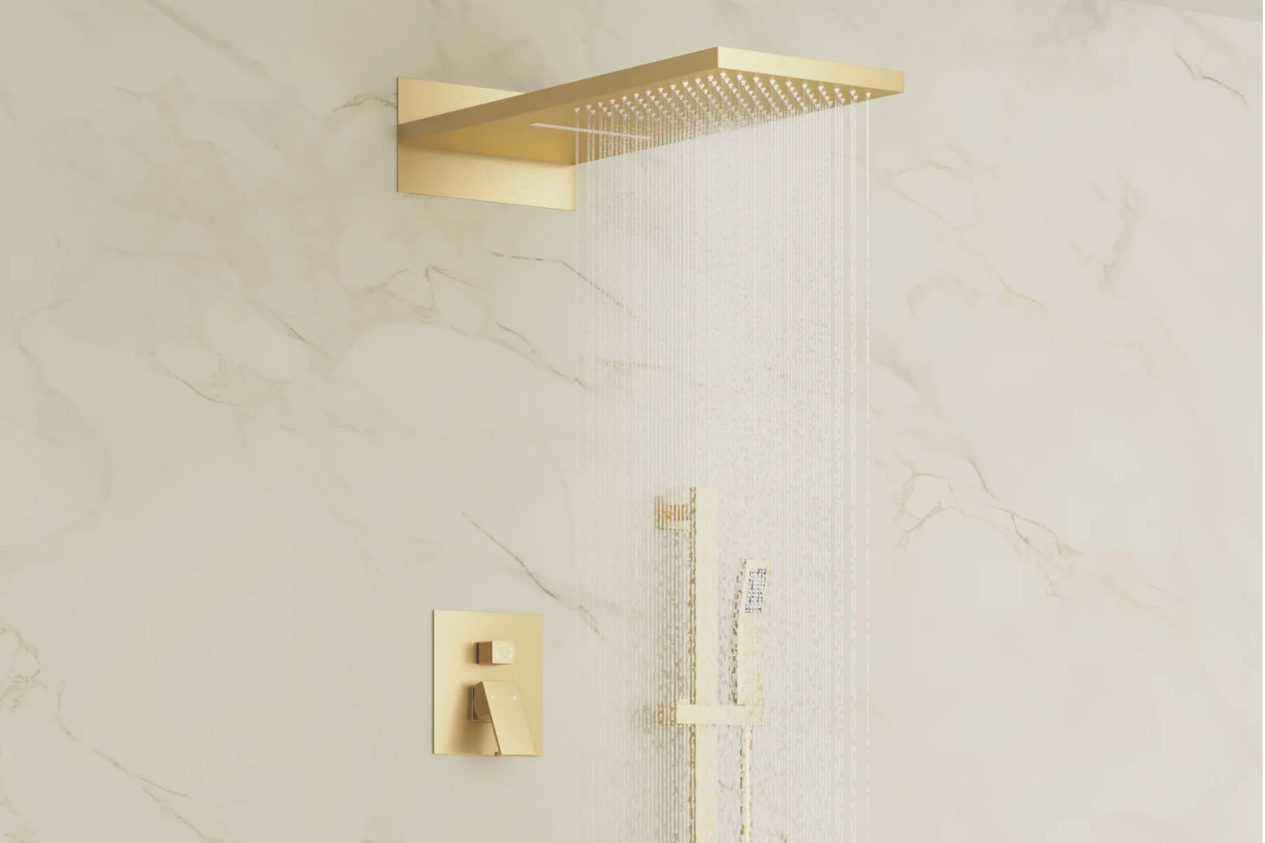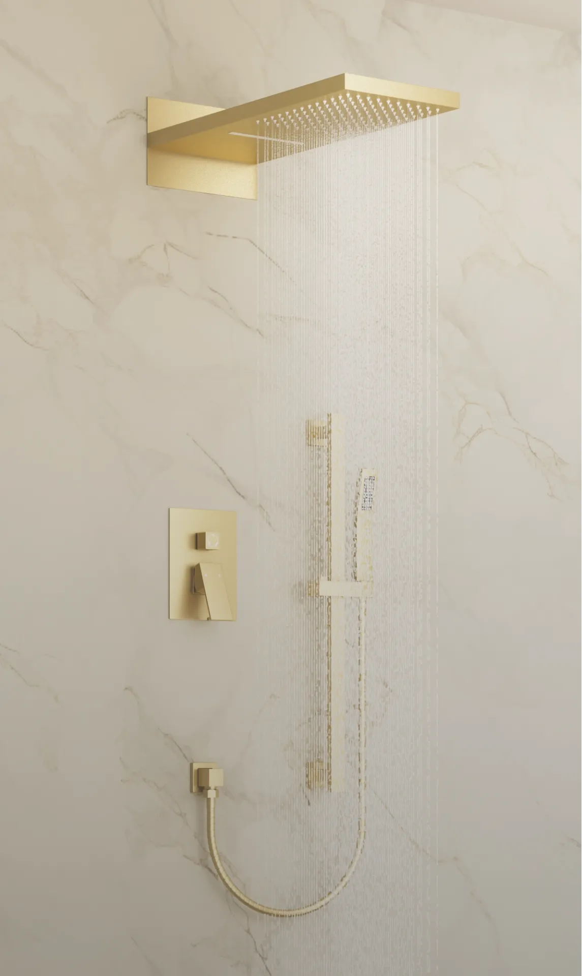The Gough shower set combines a drenching rain showerhead with a flexible hand shower and slide bar, all managed through a single, streamlined control valve. A unified geometric profile delivers balanced function and a modern spa feel.