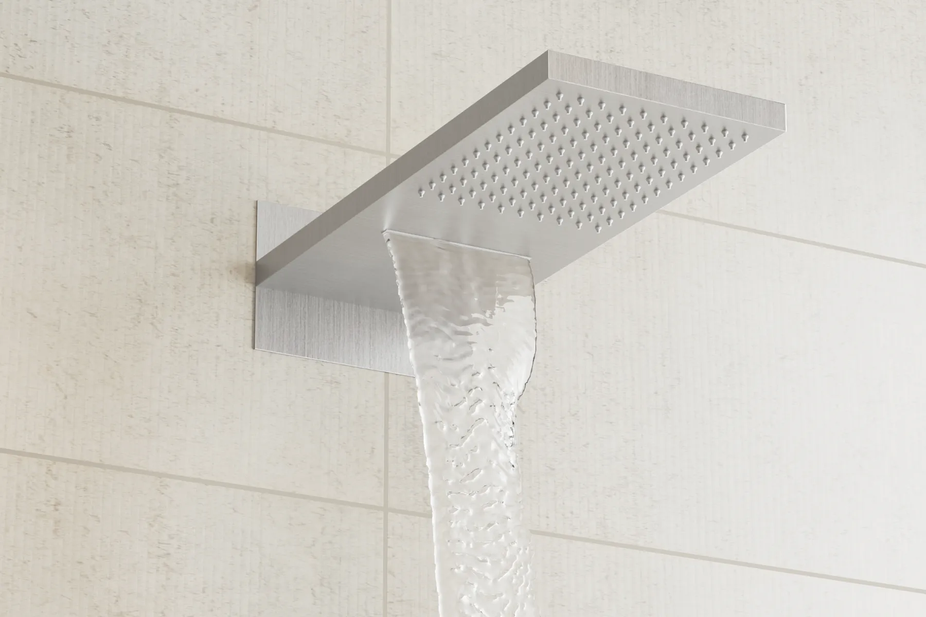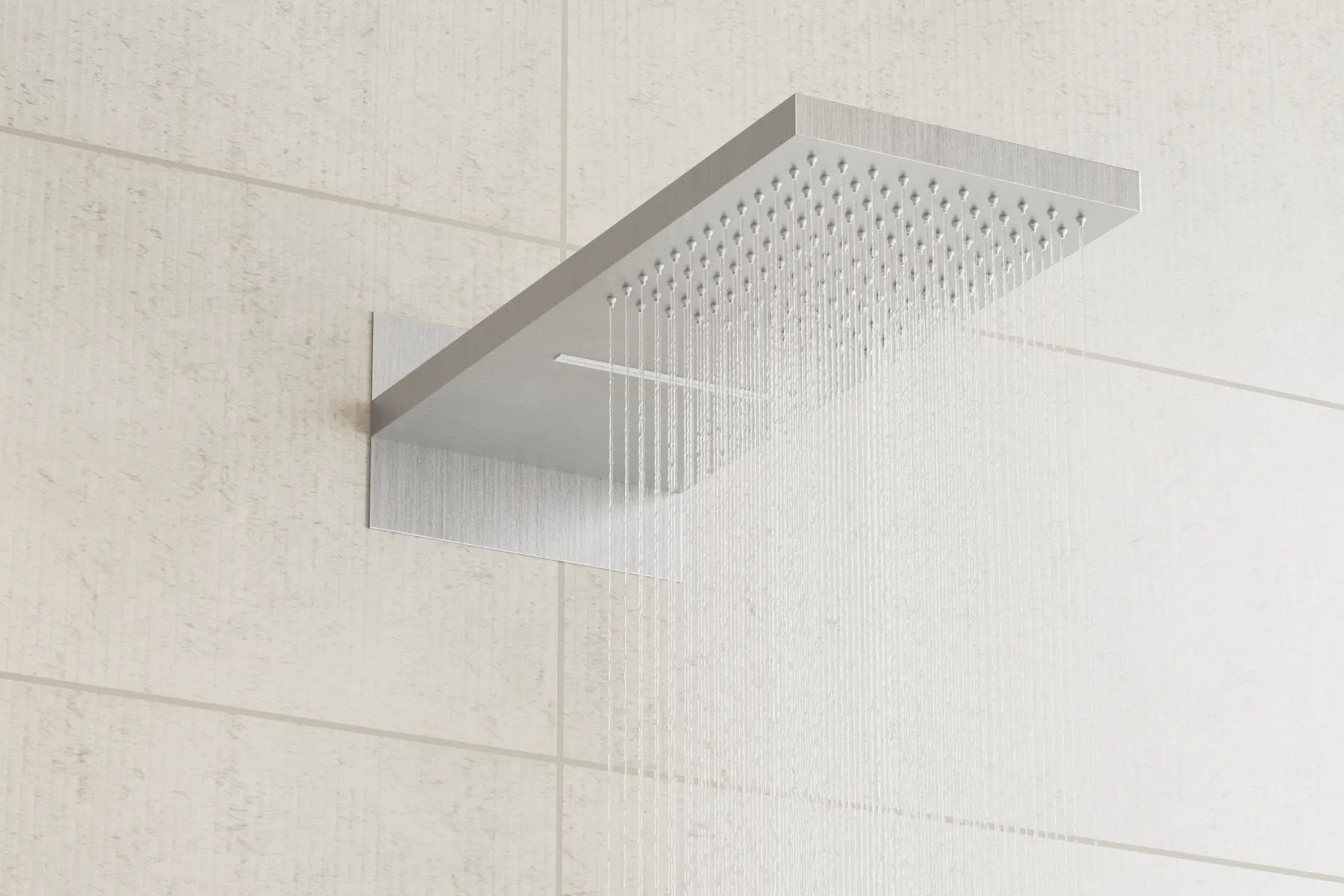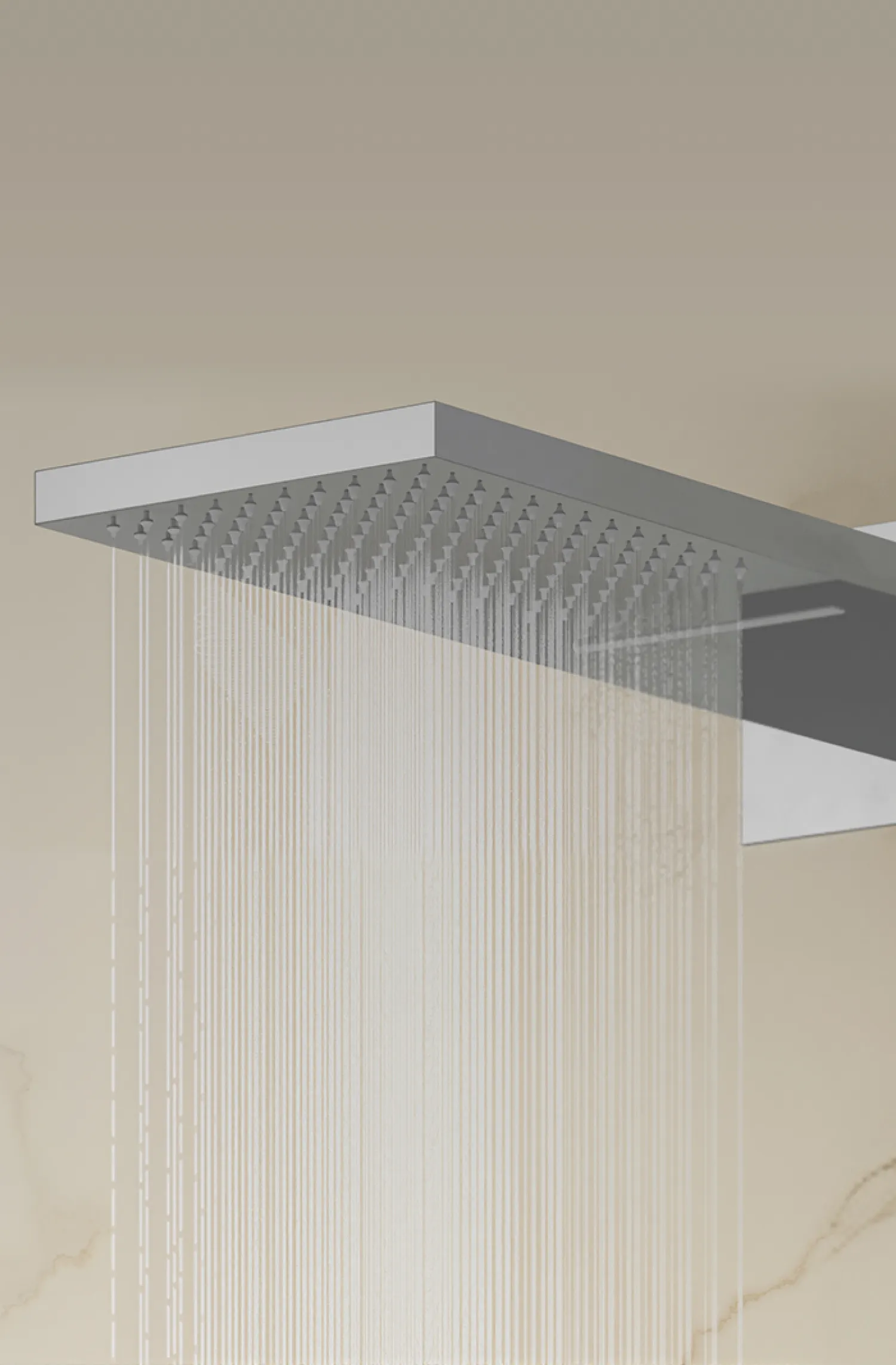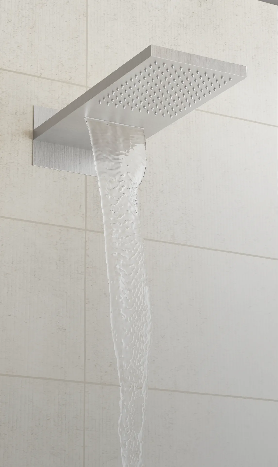 Immerse in a smooth, sheet-like cascade with the Gough waterfall outlet. The continuous flow delivers focused relaxation, framed by the series’s architectural edges and refined metal surfaces for a striking spa effect.