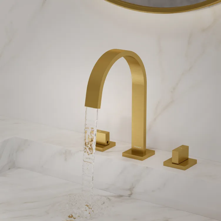 The graceful high-arc spout meets the timeless cross handles in striking brushedgold, marrying tradition with cutting-edge design. This widespread three-pieceset delivers unparalleled symmetry and tactile precision.