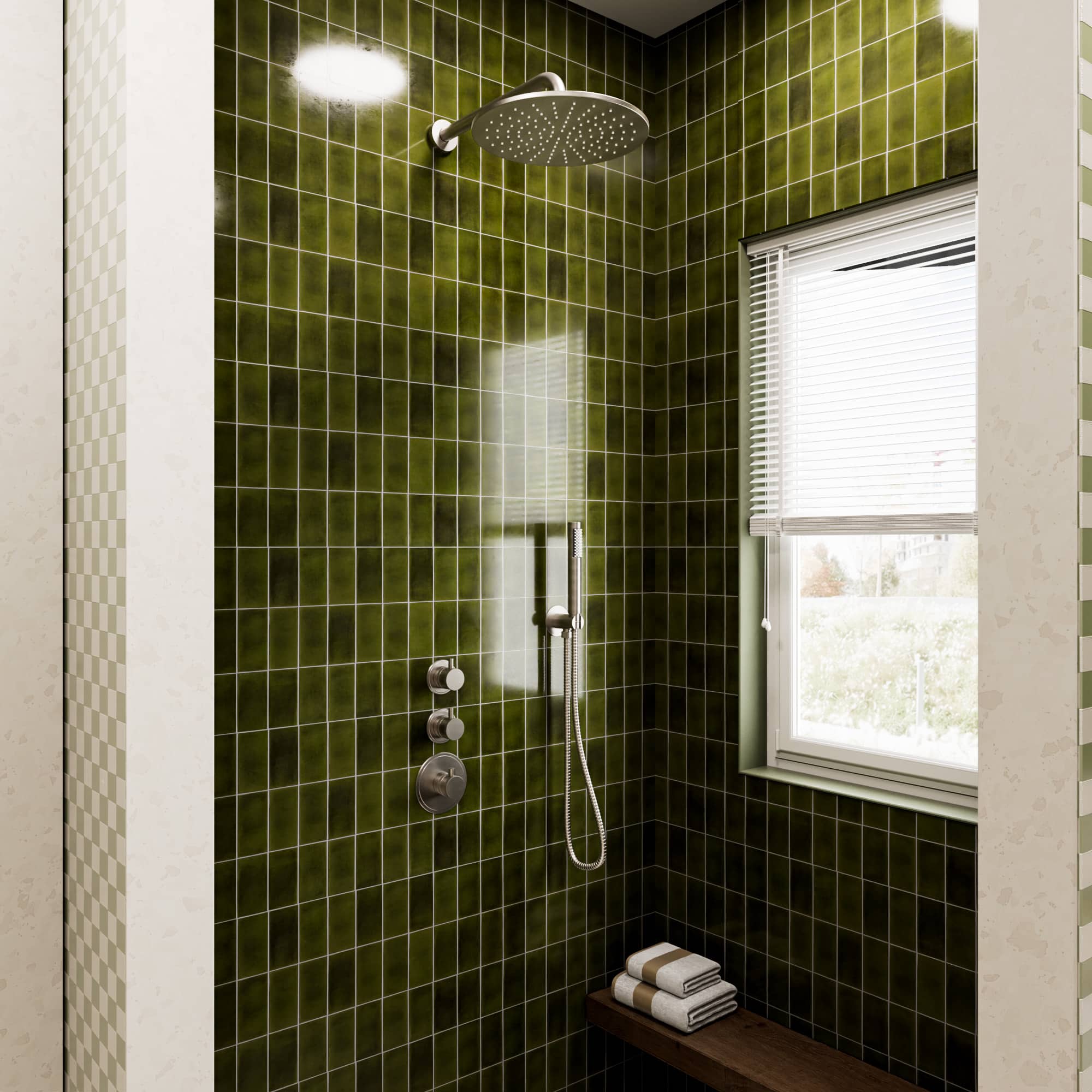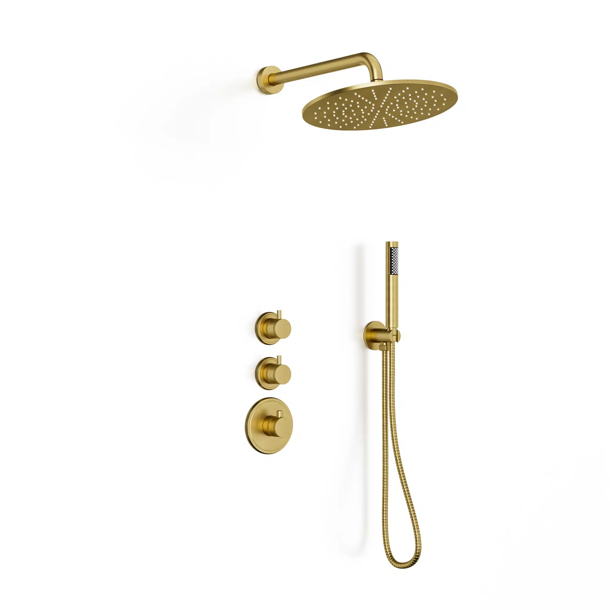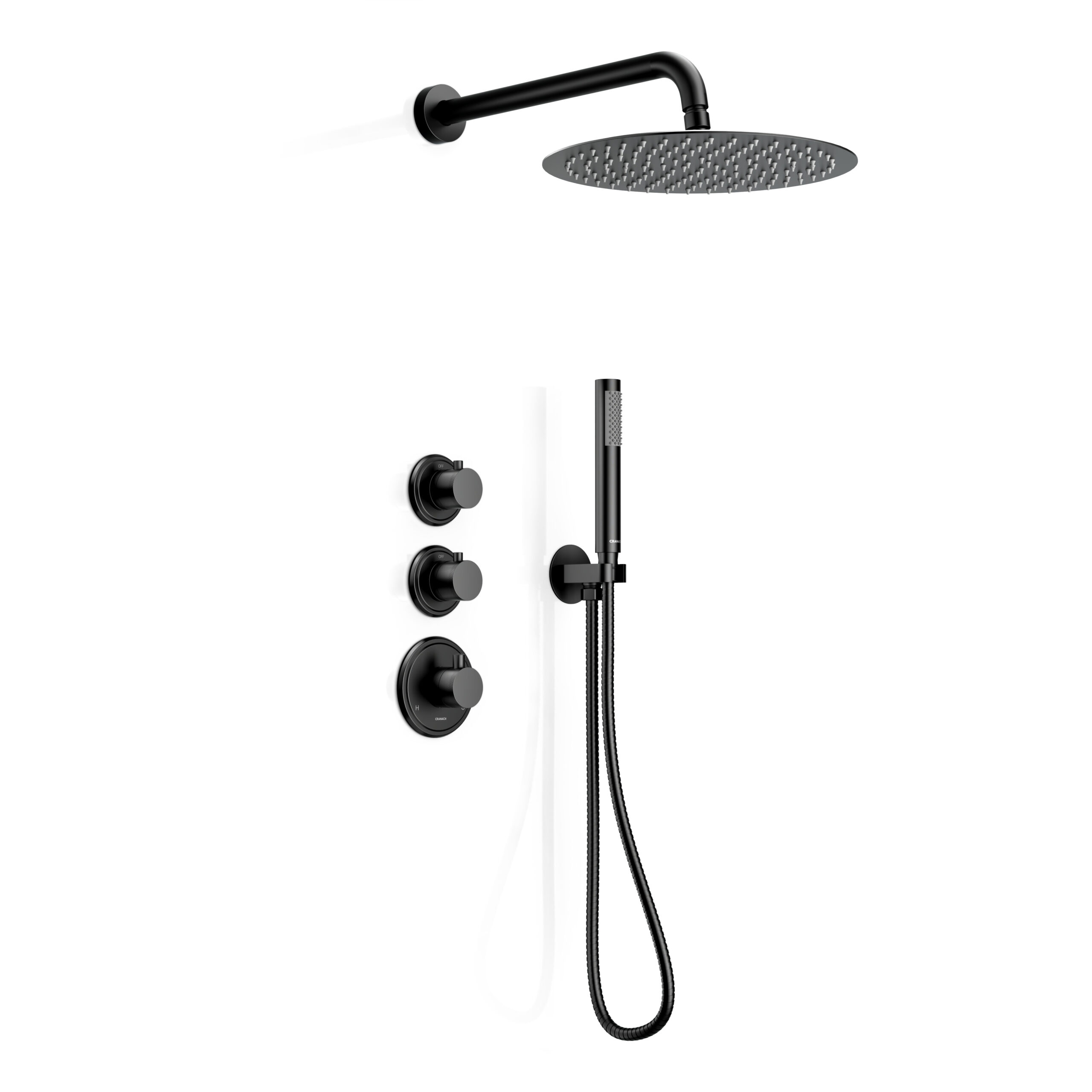 • This shower head kit includes a single-function rain showerhead, a 2-outlet thermostatic valve with trim, and a handshower set.
