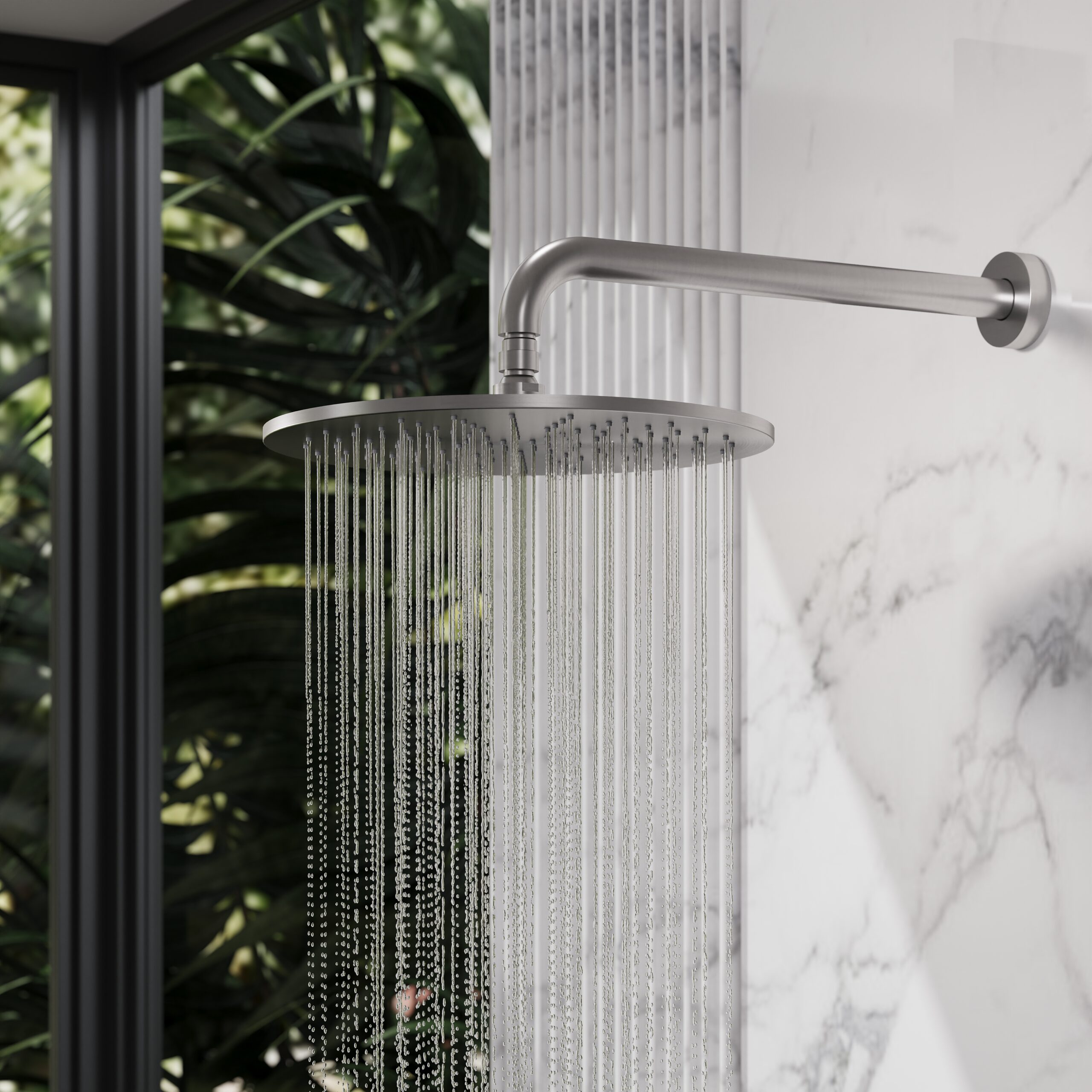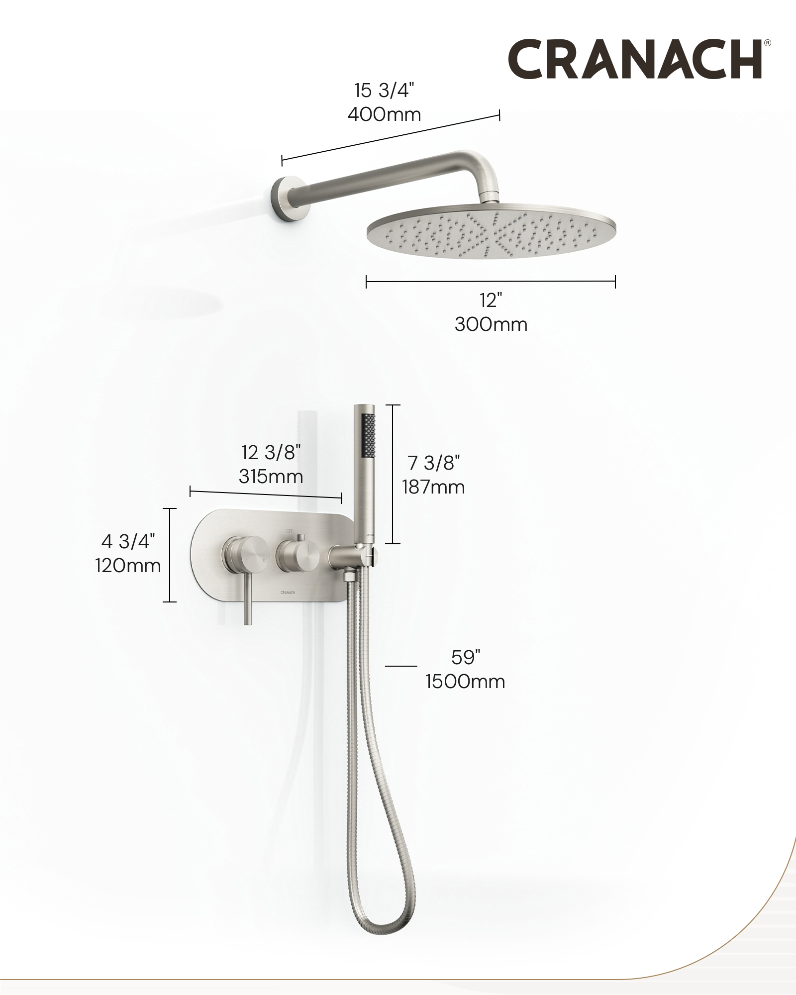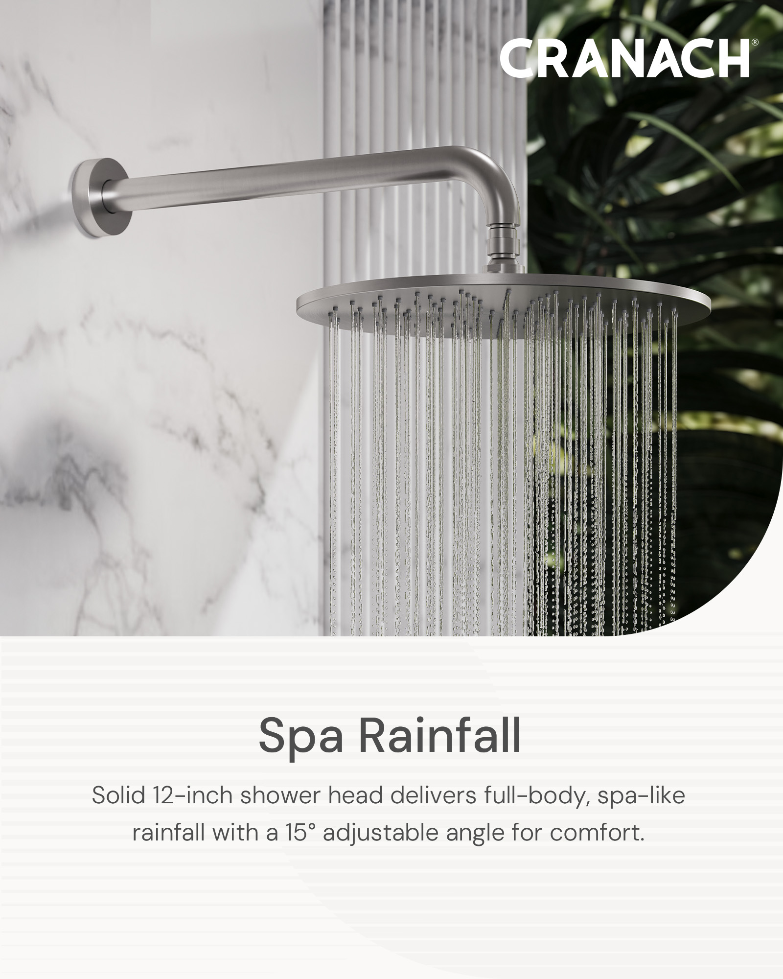 • 12″-inch rain showerhead provides a strong 1.75 GPM flow for a relaxing, spa-like experience and tilts up to 15° for added adjustability.
