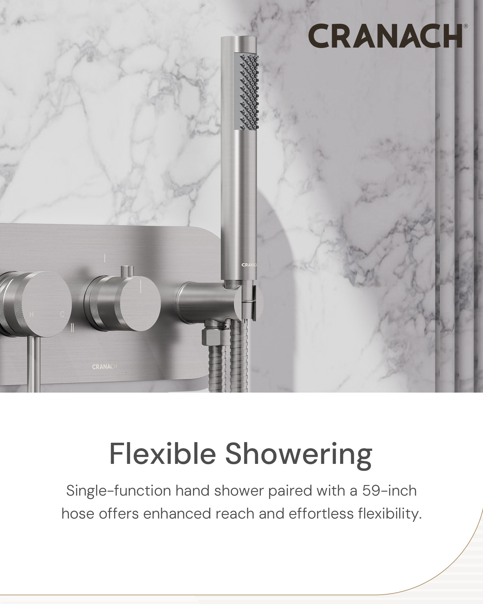 • Single-function handshower delivers a rain spray with a wall-mounted holder and 59-inch metal hose for added convenience and flexibility.