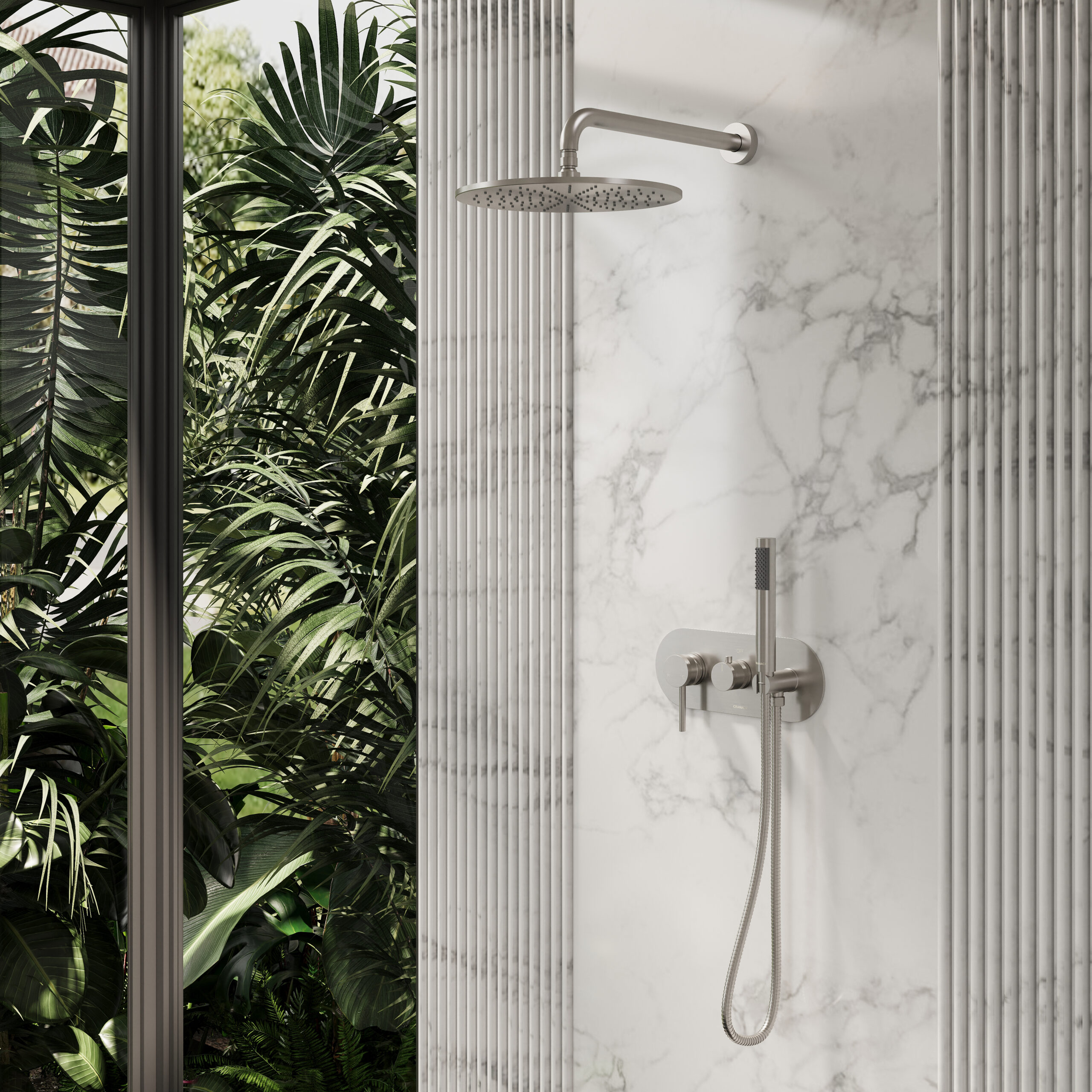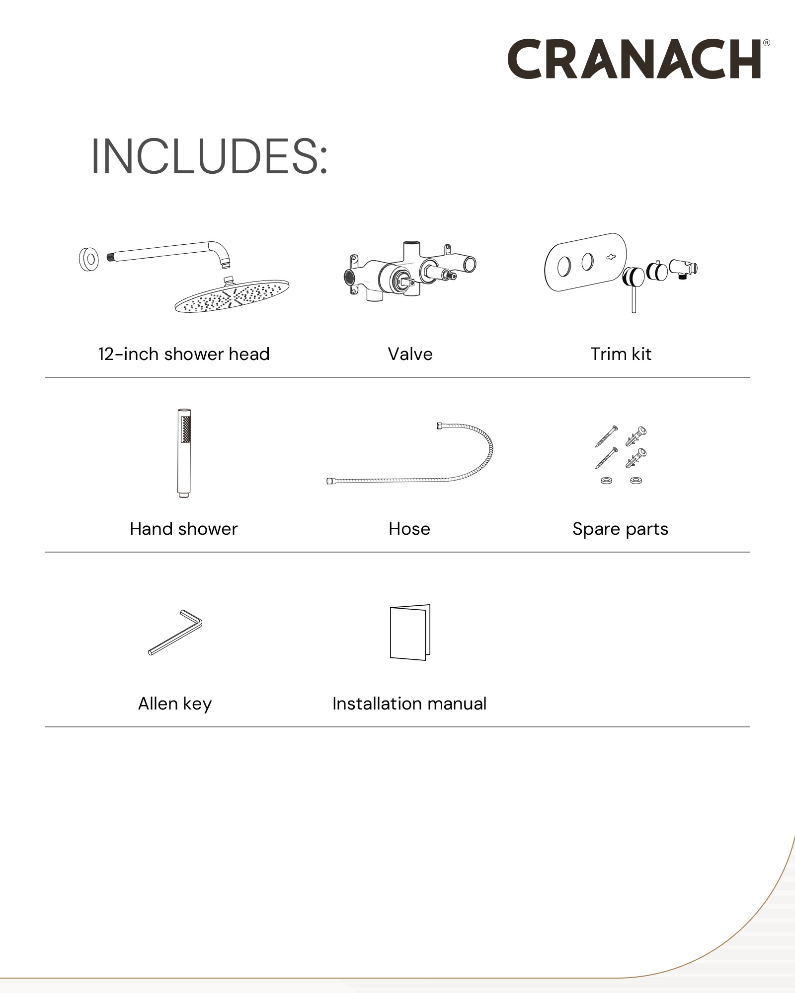 • This shower head kit includes a single-function rain showerhead , a 2-outlet pressure balance valve with trim, and a handshower set.