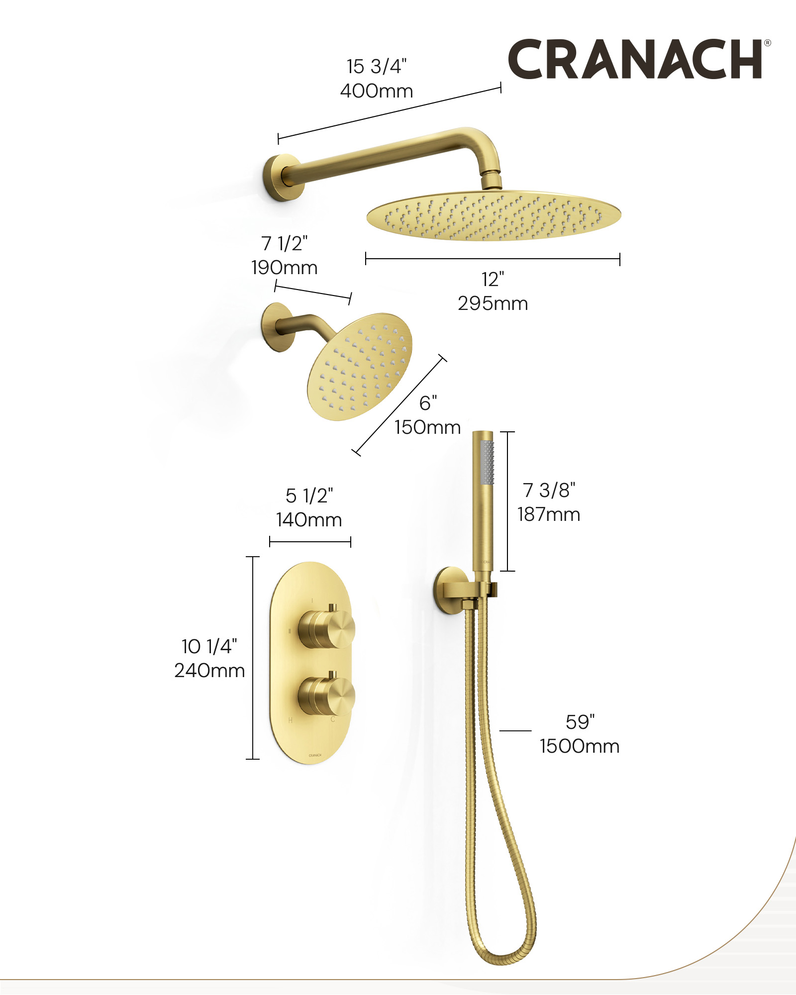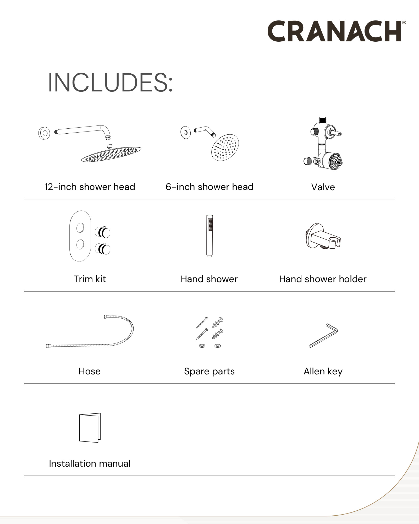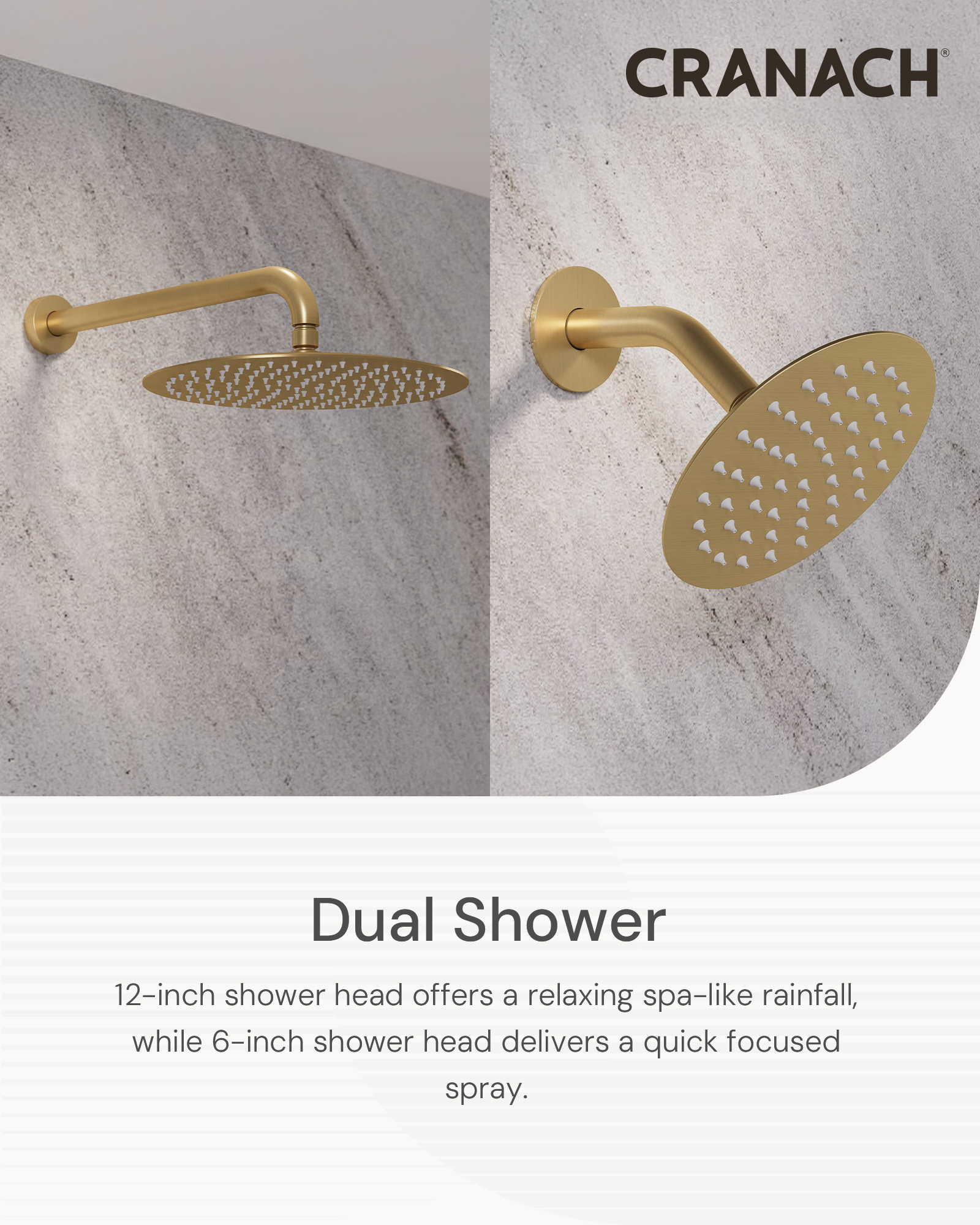• Showerhead & Hand Shower: 6″/12″ showerhead with matching hand shower