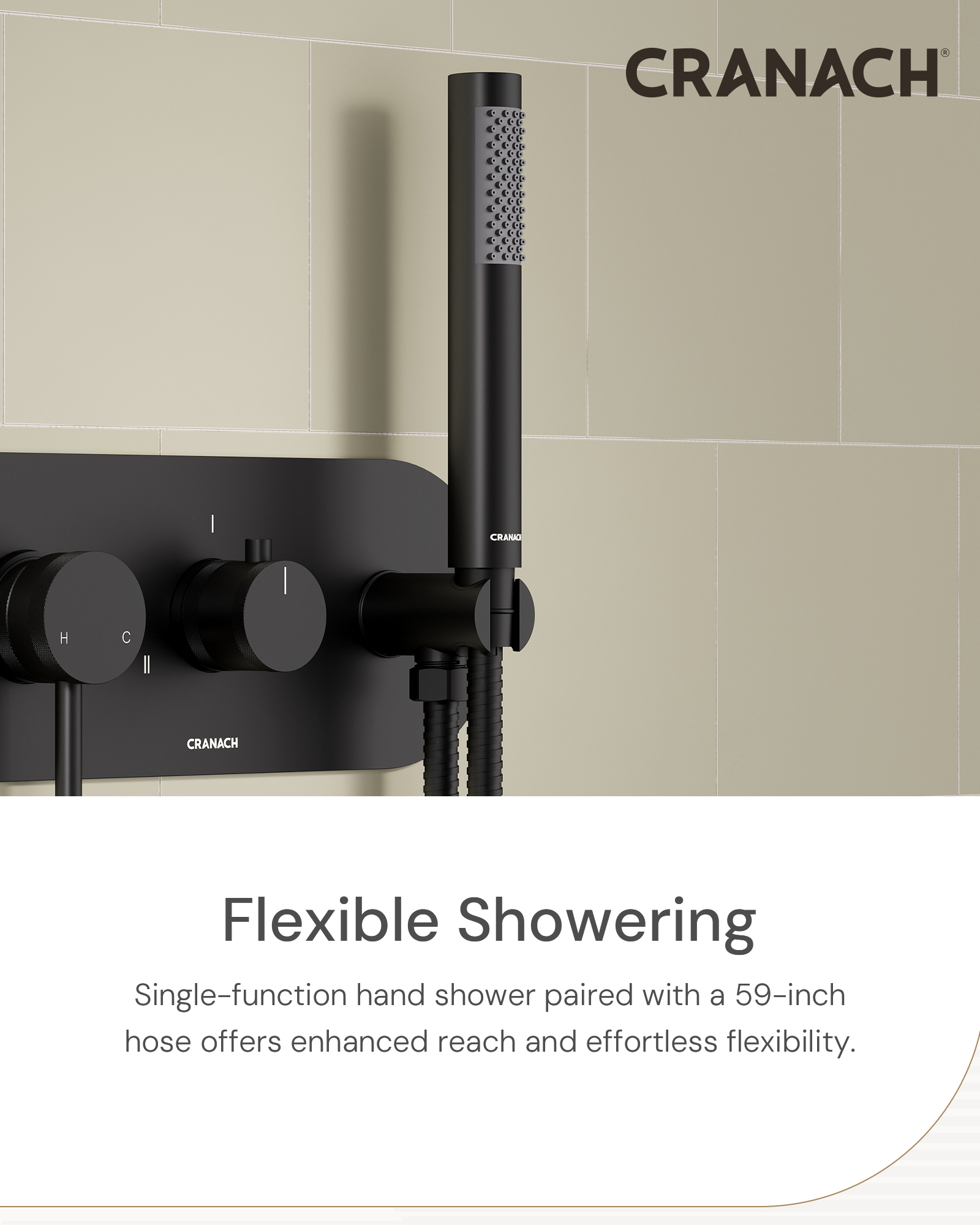 • Handshower delivers a rain spray with a wall-mounted holder and 59-inch metal hose for added convenience and flexibility.