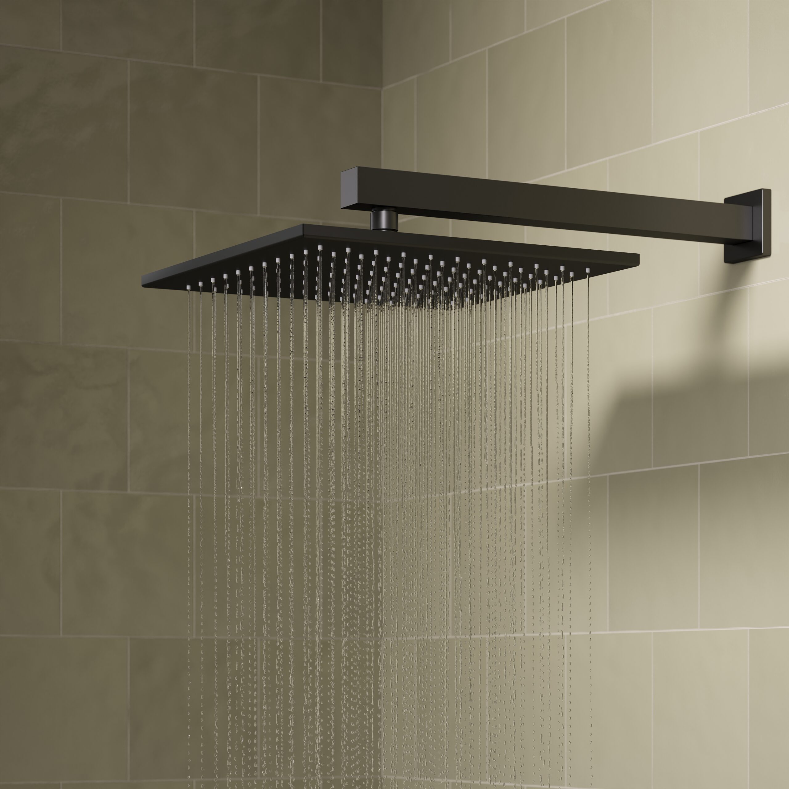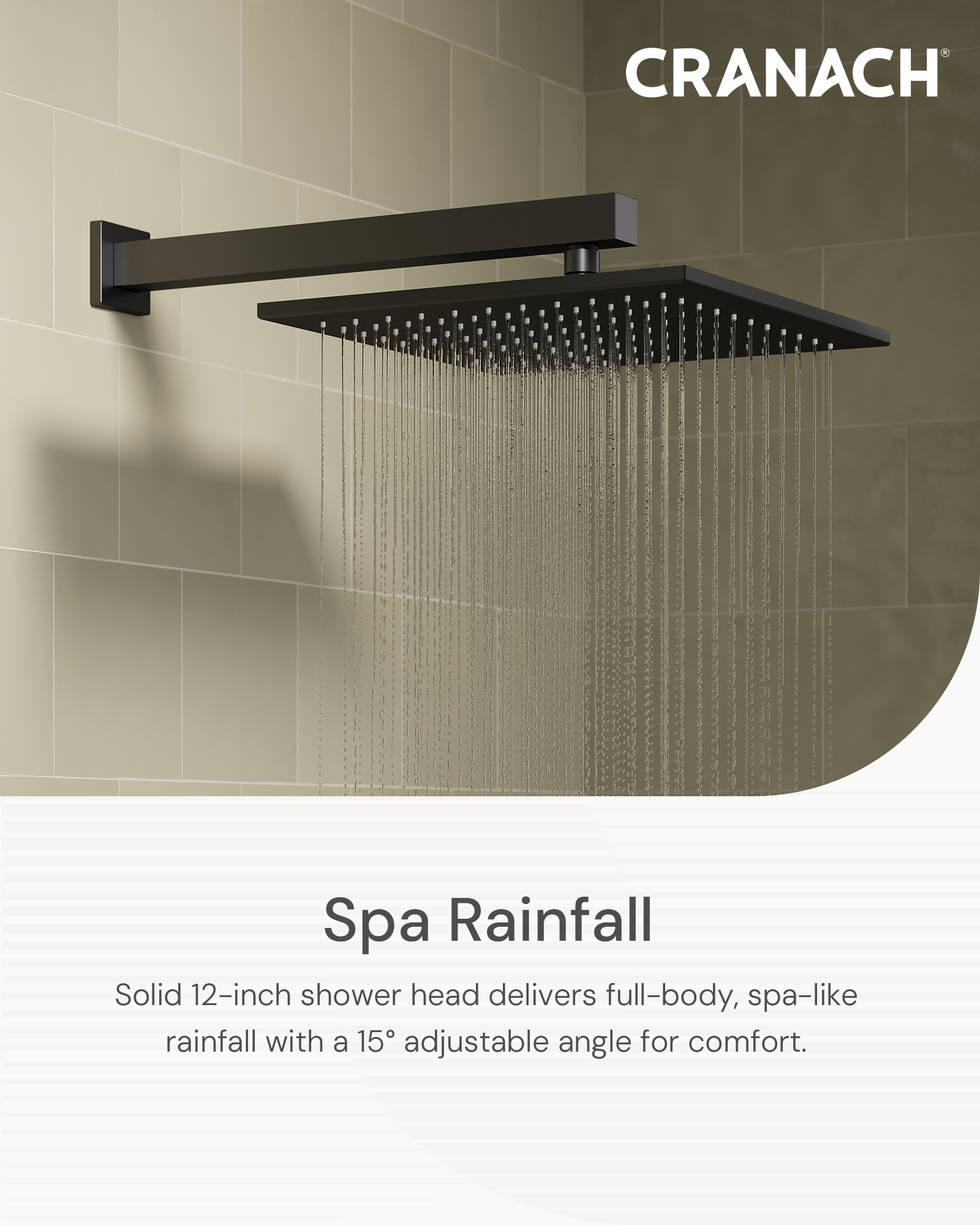 • 12-inch rain showerhead provides a strong flow for a relaxing, spa-like experience and tilts up to 15° for added adjustability. Showerhead offers dual flow options—2.5 GPM/80 PSI or 1.75 GPM/80 PSI—by replacing the flow restrictor in the accessory pack, letting you choose between high performance and water savings.