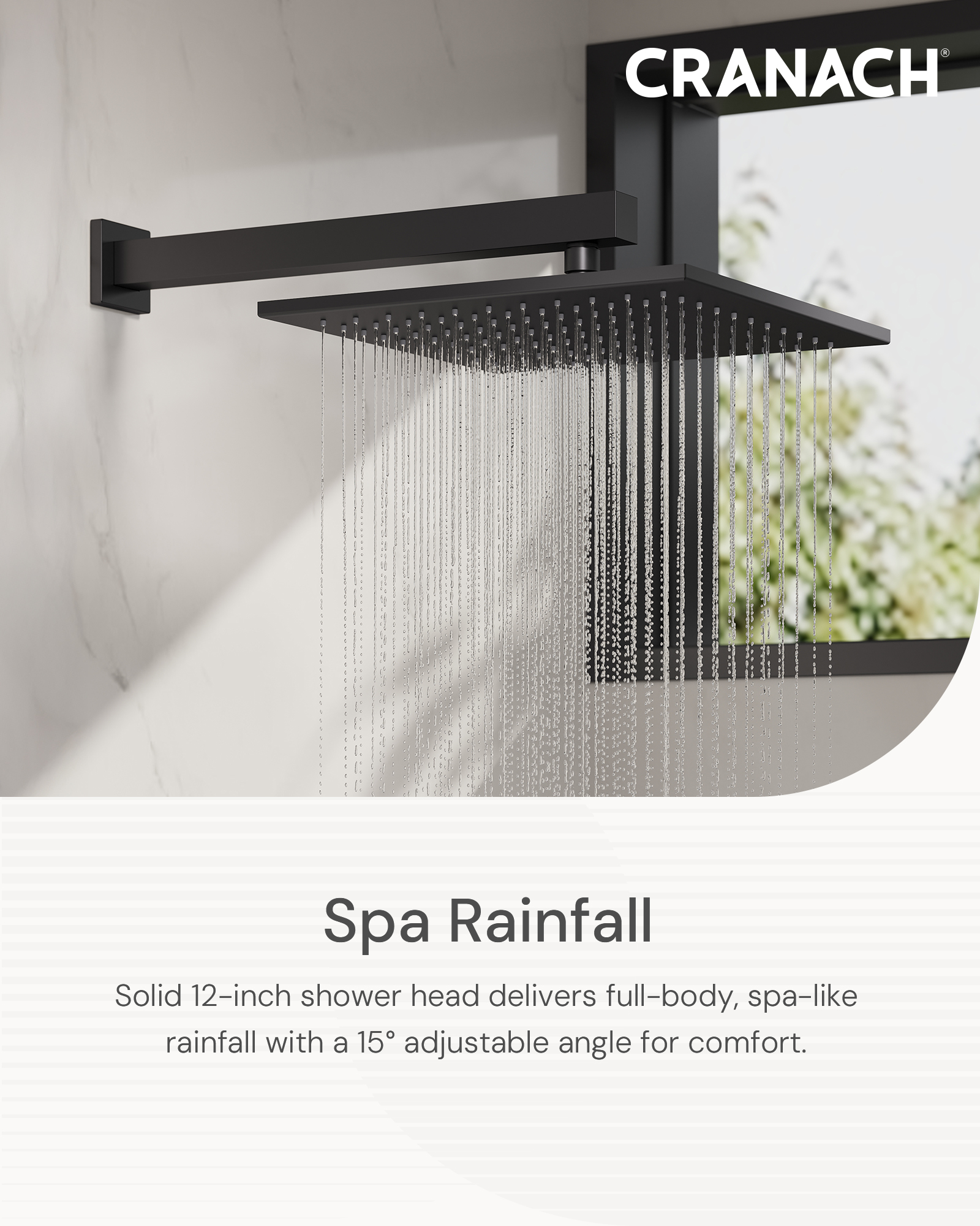 • 12-inch rain showerhead provides a strong flow for a relaxing, spa-like experience and tilts up to 15° for added adjustability.