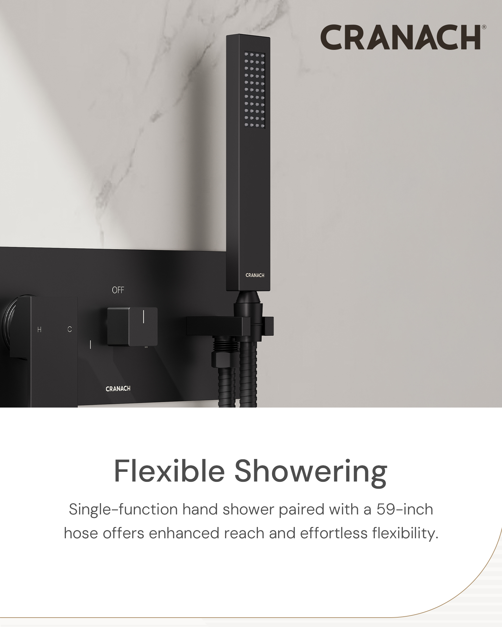 • Single-function handshower delivers a rain spray, with a wall-mounted holder and 59-inch hose for added convenience and flexibility.