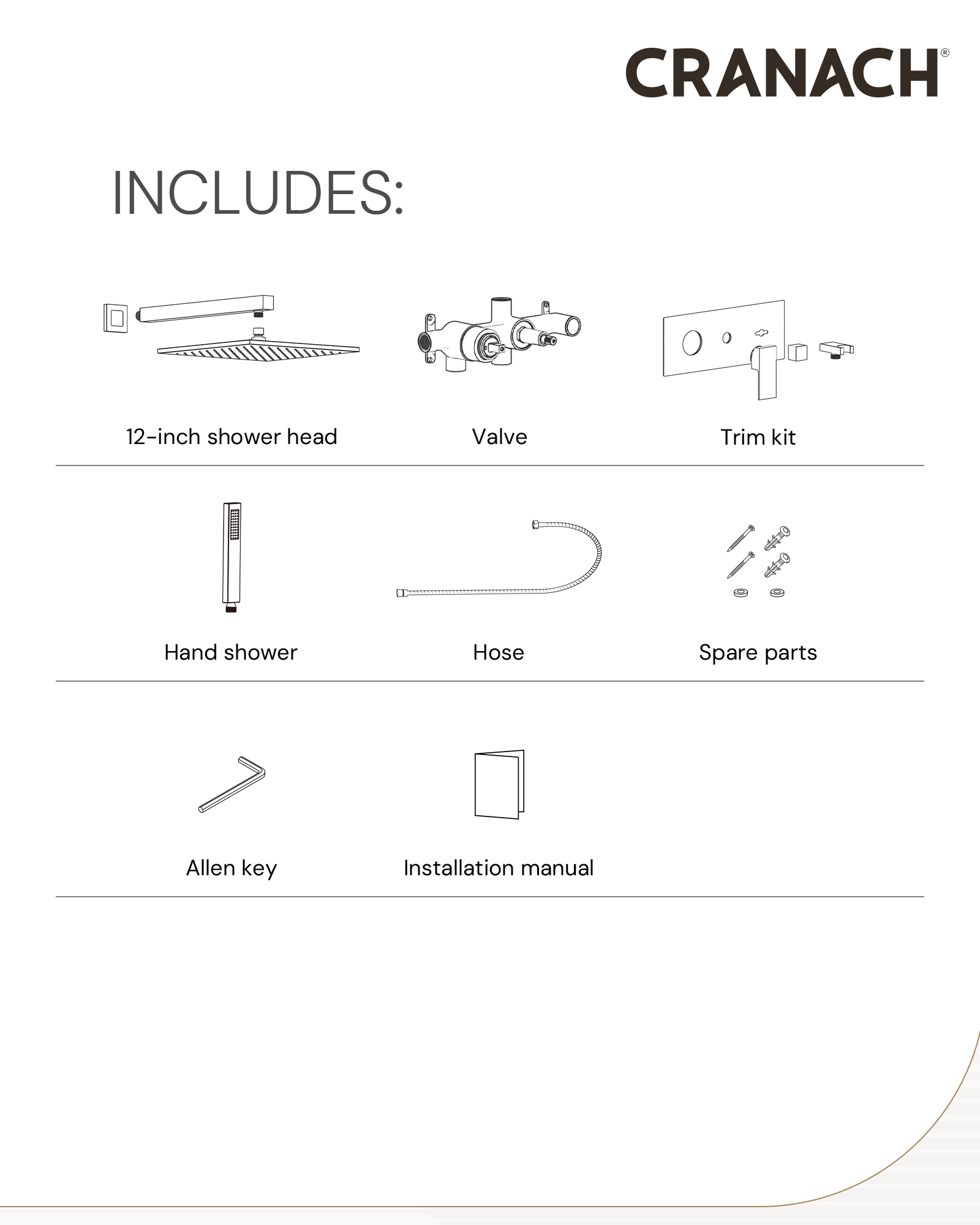 • This shower set includes a single-function rain showerhead, a 2-outlet pressure balance valve with trim, and a hand shower set.