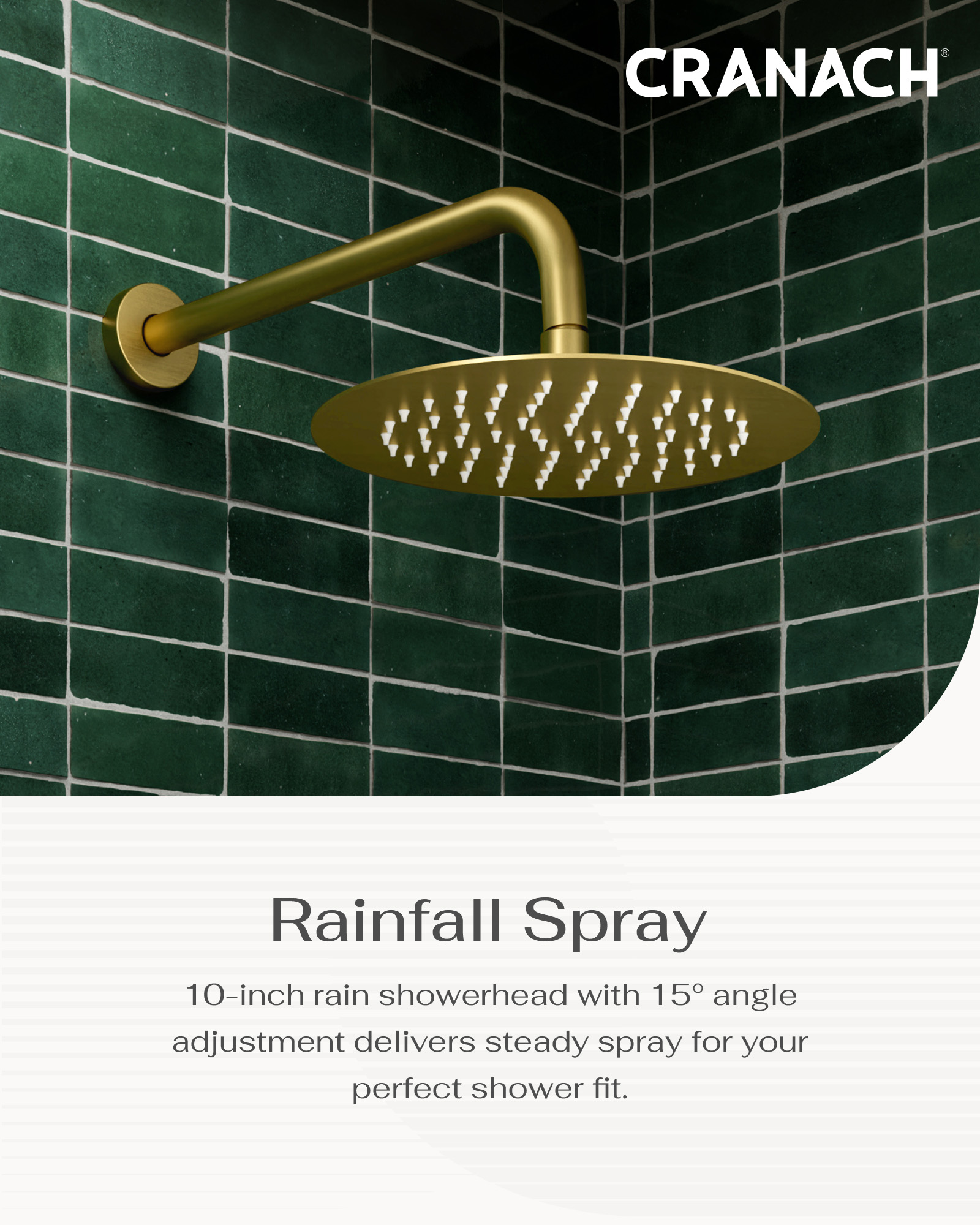 • 10-inch rain showerhead provides a strong 2.5 GPM flow for a relaxing, spa-like experience and tilts up to 15° for added adjustability.