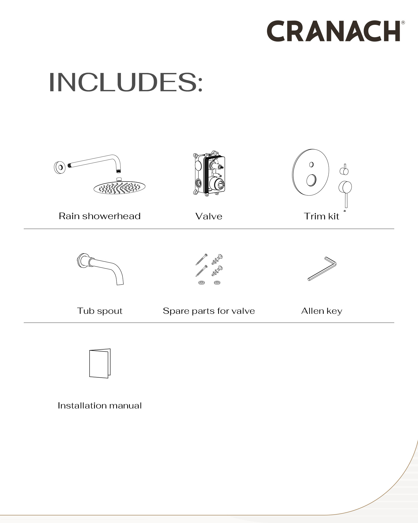• This shower kit includes a single function 2.5 GPM ultra-thin showerhead, 15.75-inch shower arm, 2-outlet pressure balance with trim, and a tub faucet.