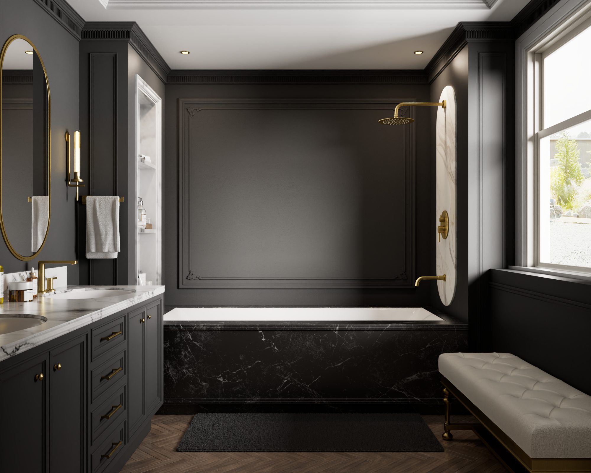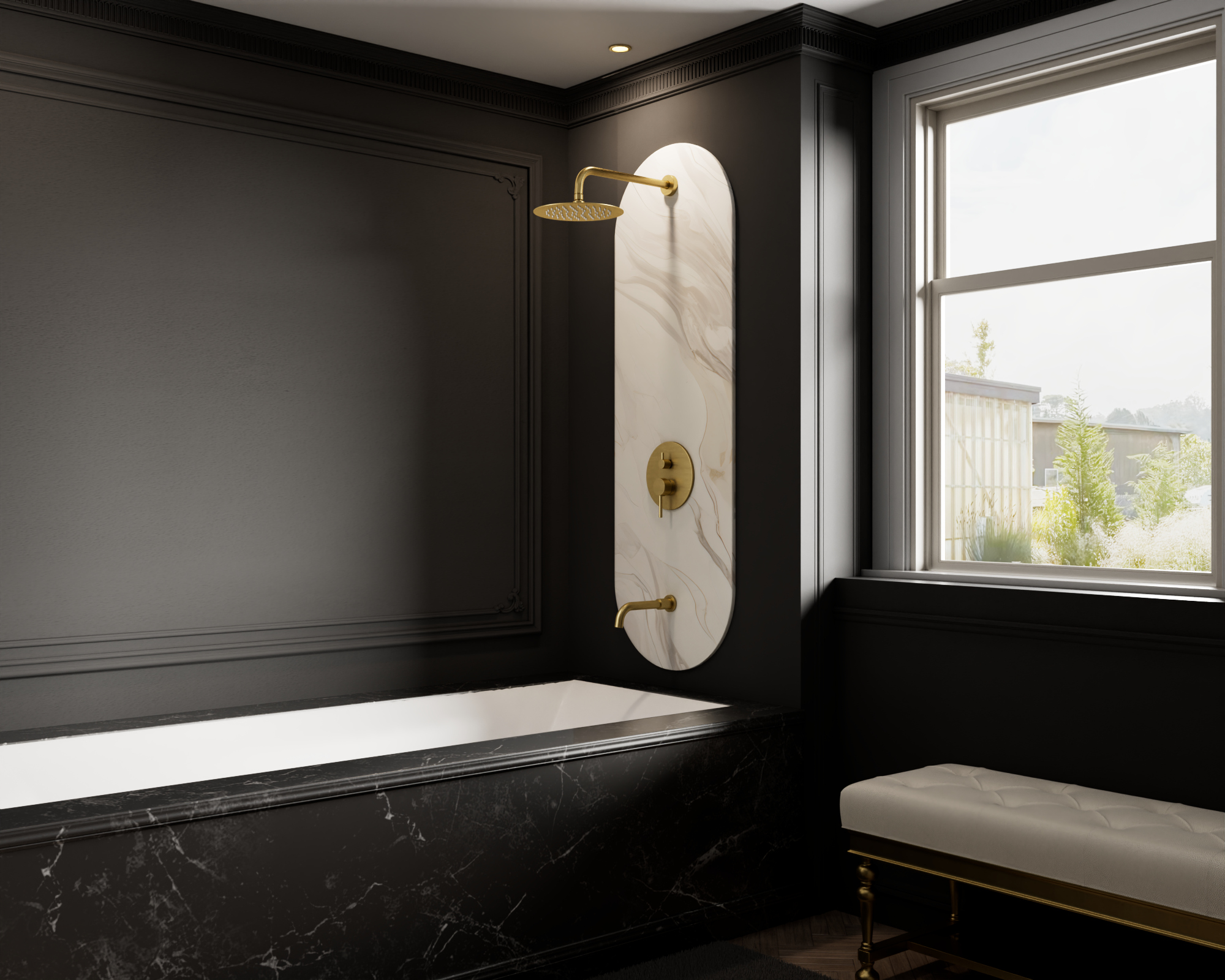 10-inch ultra-thin round showerhead with tub spout, valve, and trim in Brushed Gold – sleek tub shower faucet set