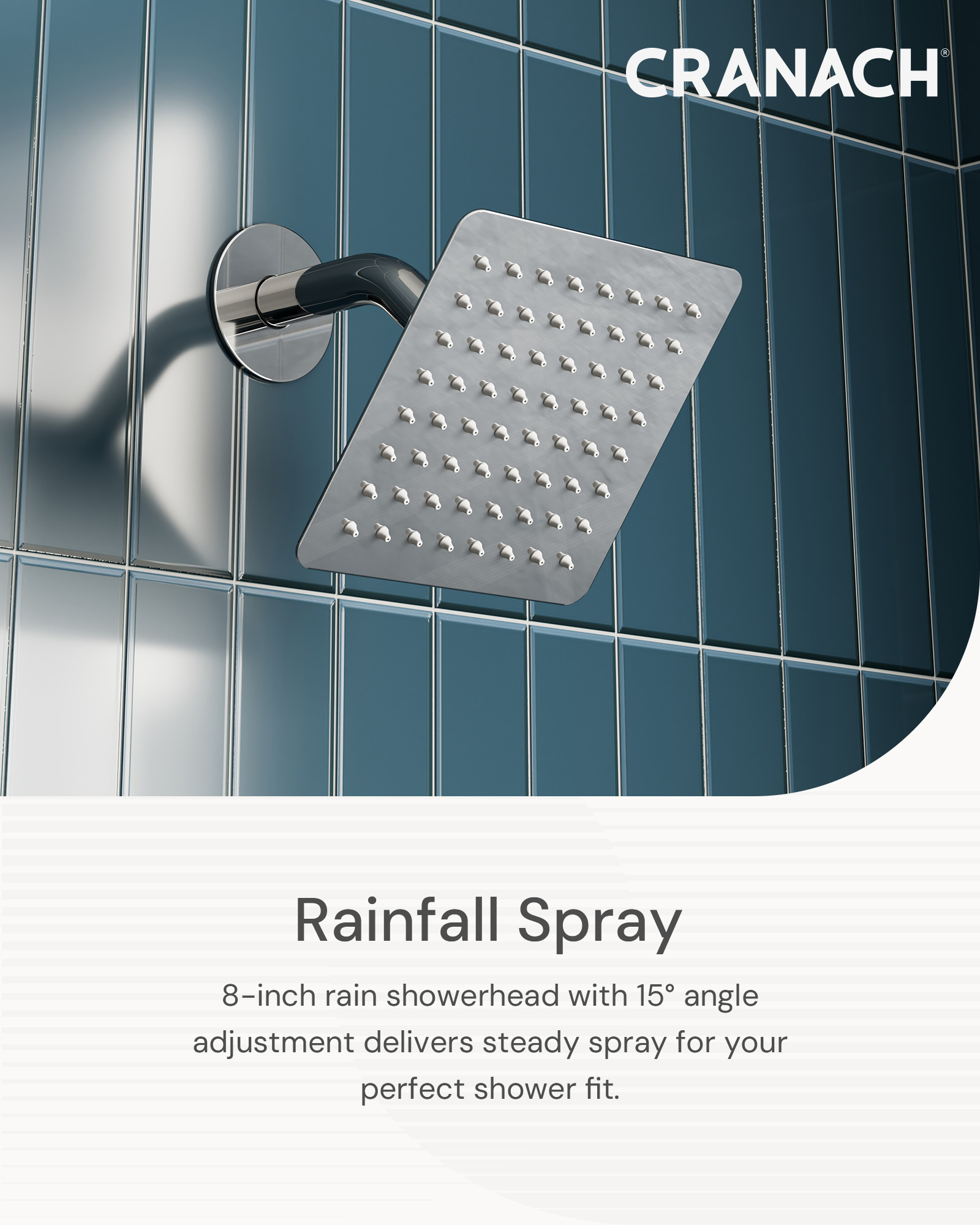 • 8-inch rain showerhead provides a strong flow for a relaxing, spa-like experience and tilts up to 15° for added adjustability.
