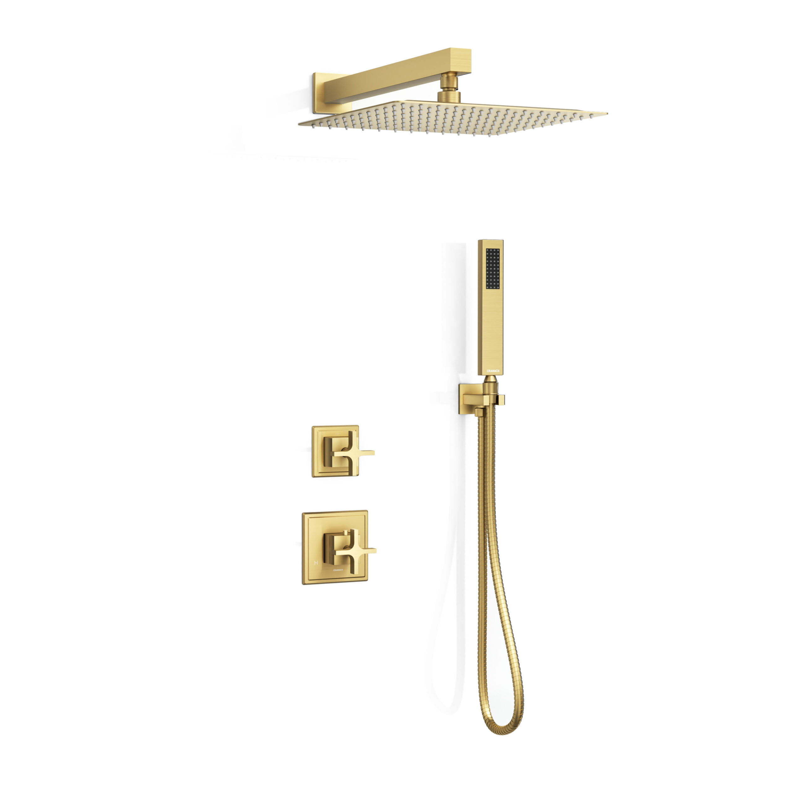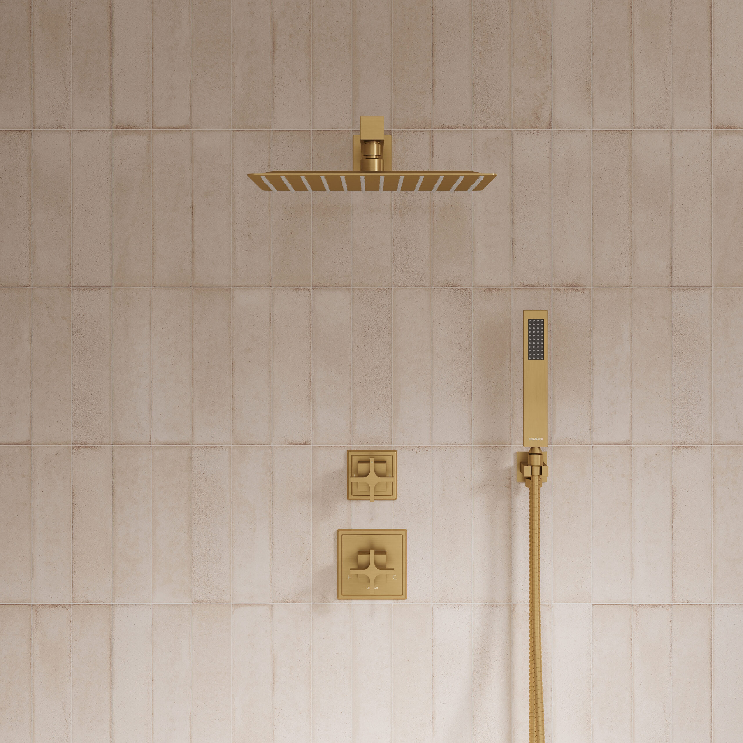 • This shower faucet system includes a single-function rain showerhead, a 2-outlet thermostatic valve with trim, and a hand shower set.