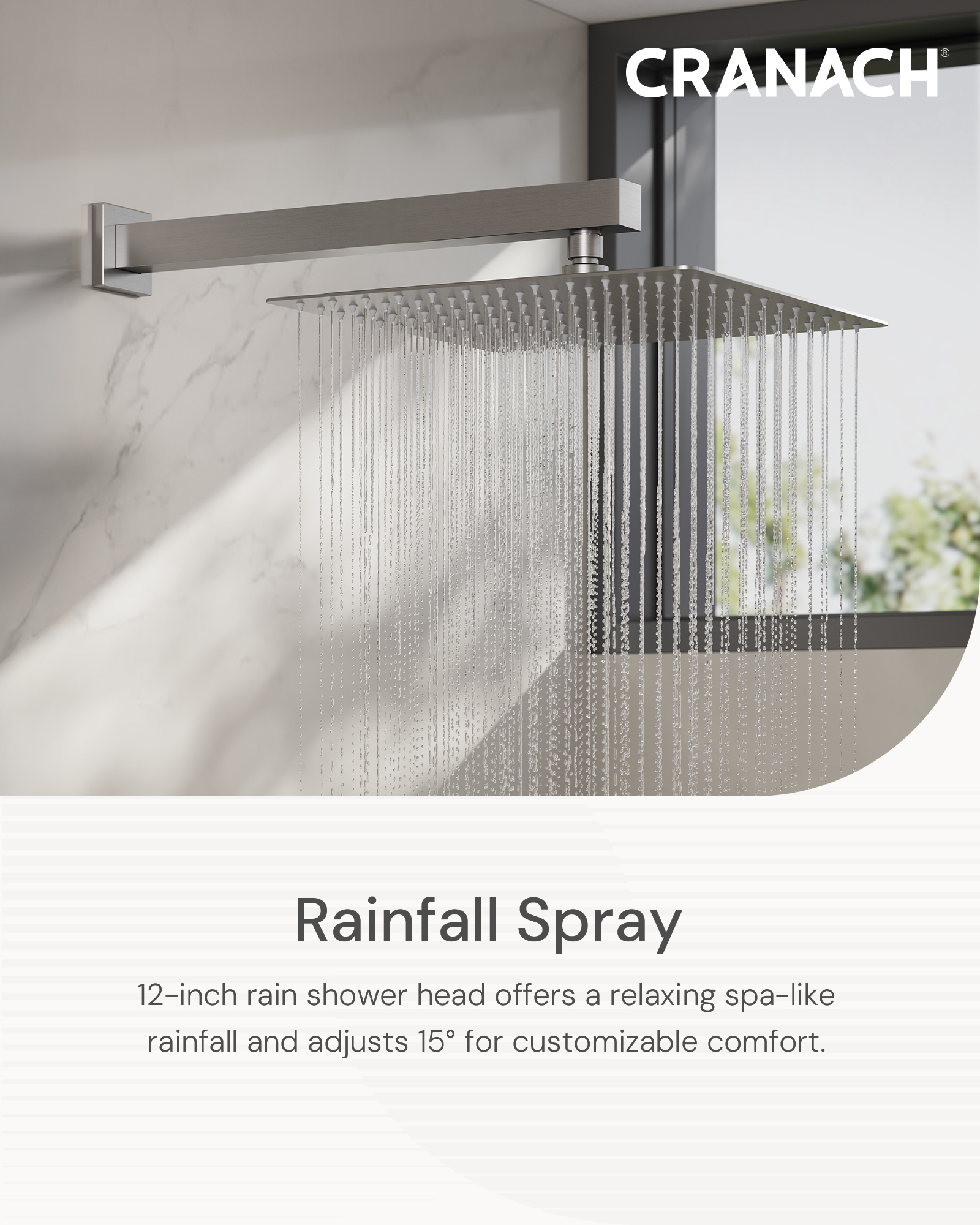 • 12-inch rain showerhead provides a strong flow for a relaxing, spa-like experience and tilts up to 15° for added adjustability.