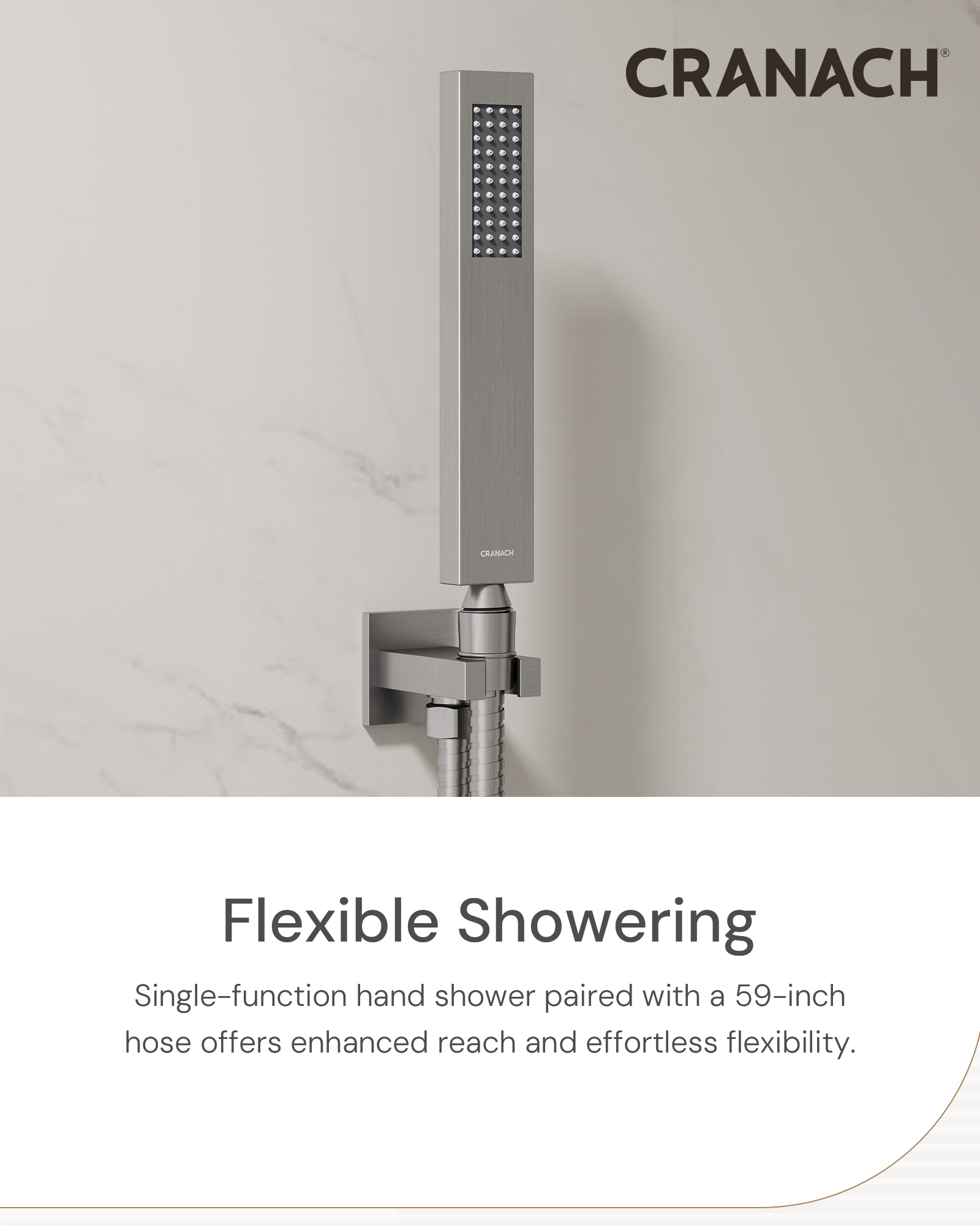 • Single-function handshower delivers a rain spray, with a wall-mounted holder and 59-inch hose for added convenience and flexibility.