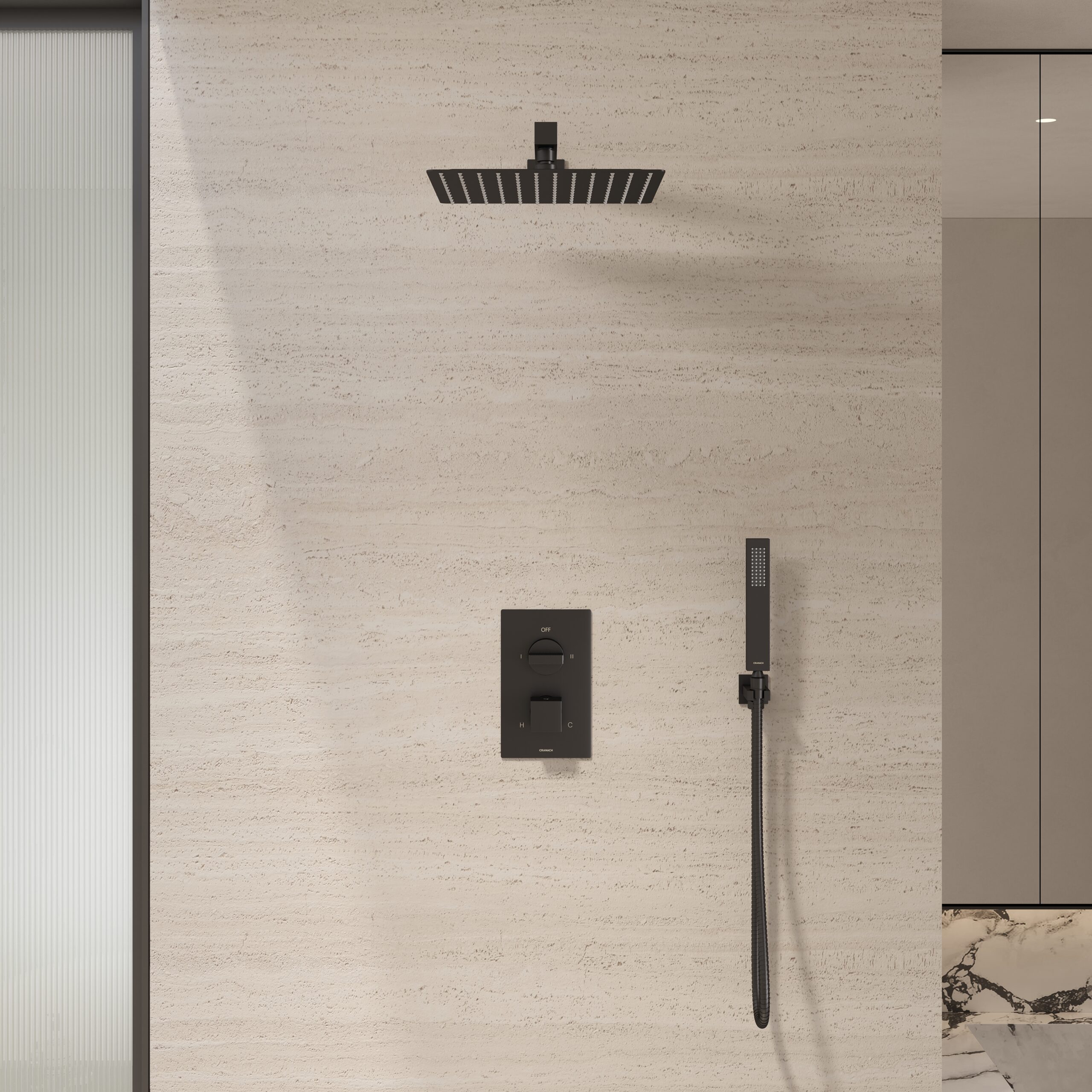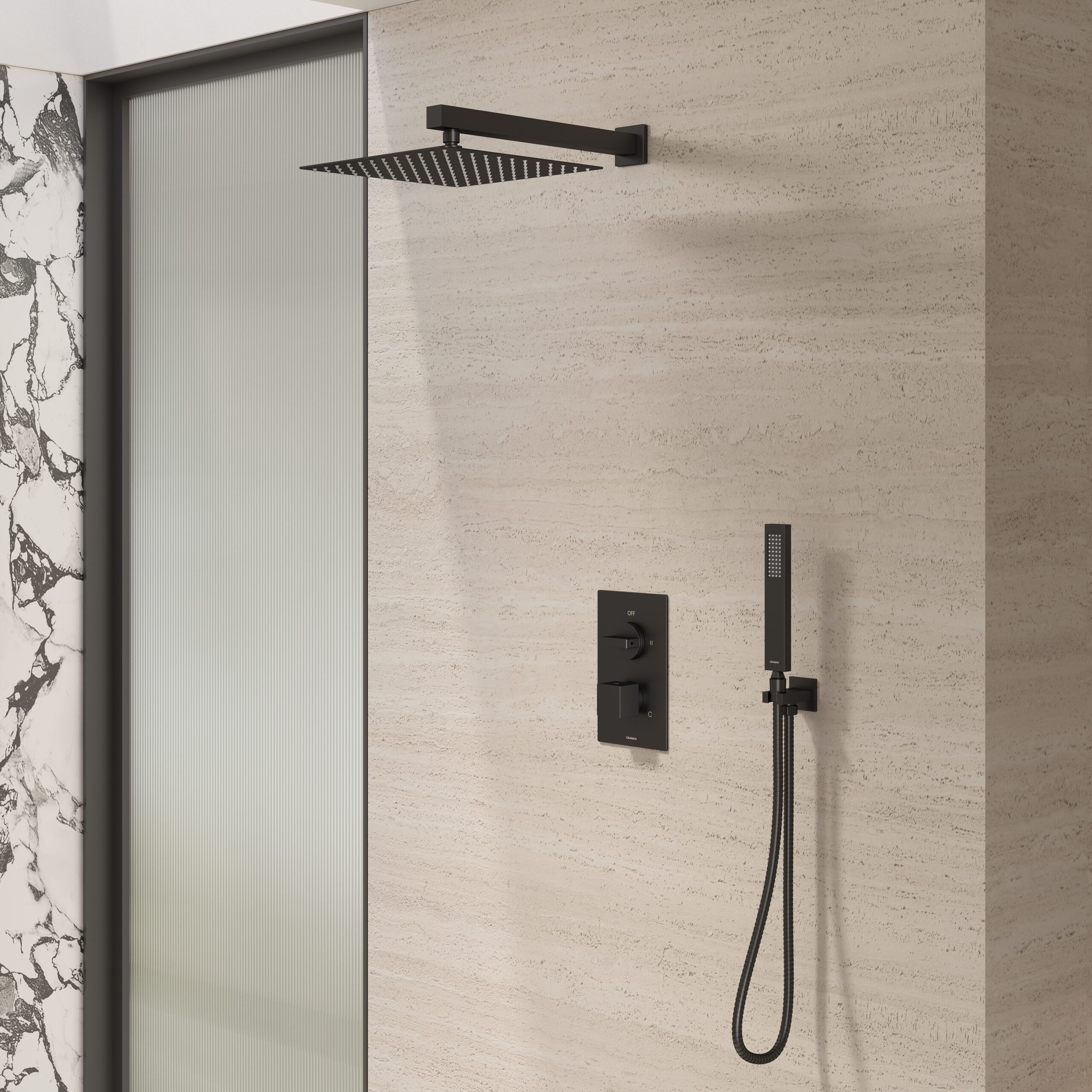 • This shower faucet system includes a single-function rain showerhead, a 2-outlet pressure balance valve with trim, and a hand shower set.