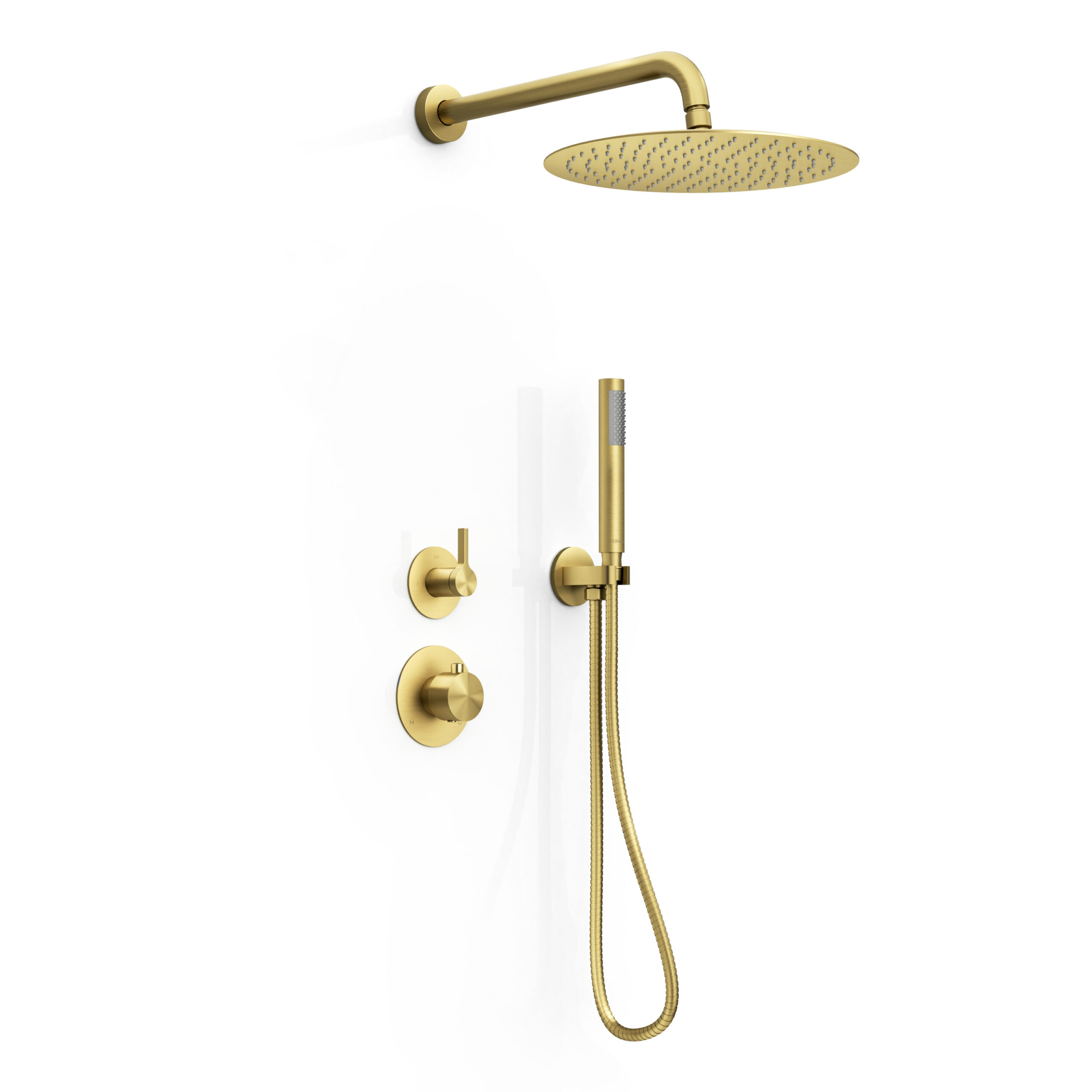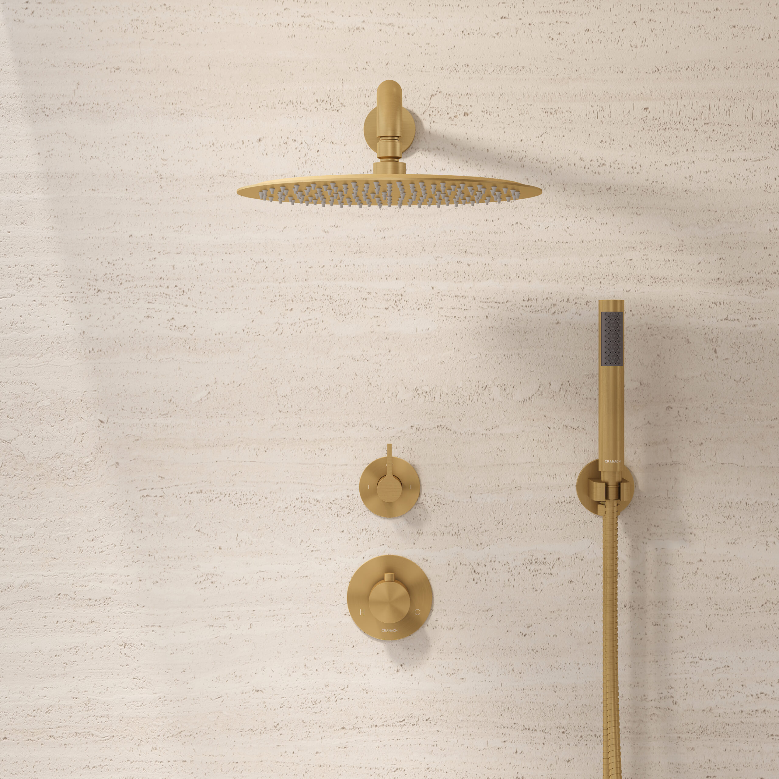 • This shower faucet system includes a 12-inch rain showerhead, a hand shower set, and a 2-function thermostatic valve with a 2-position diverter.